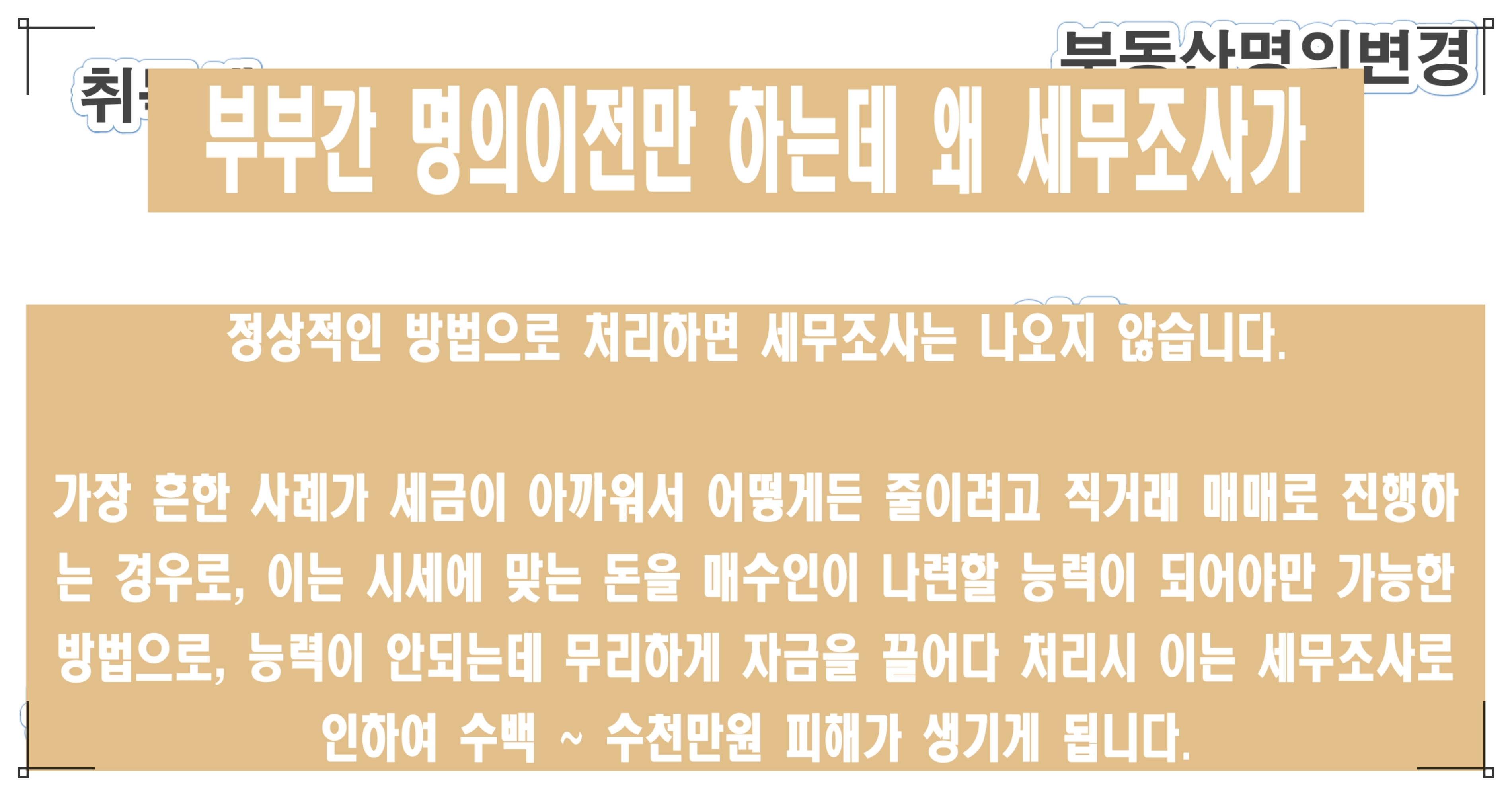 명의이전 방법은 약 20가지 정도가 있으며, 명의이전 목적에 따라 그에 맞게 처리를 해야 문제가 생기지 않게 되고, 비정상적으로 처리시 40% 이상의 벌금 그리고 5 ~ 30% 재산상 손실이 발생합니다.