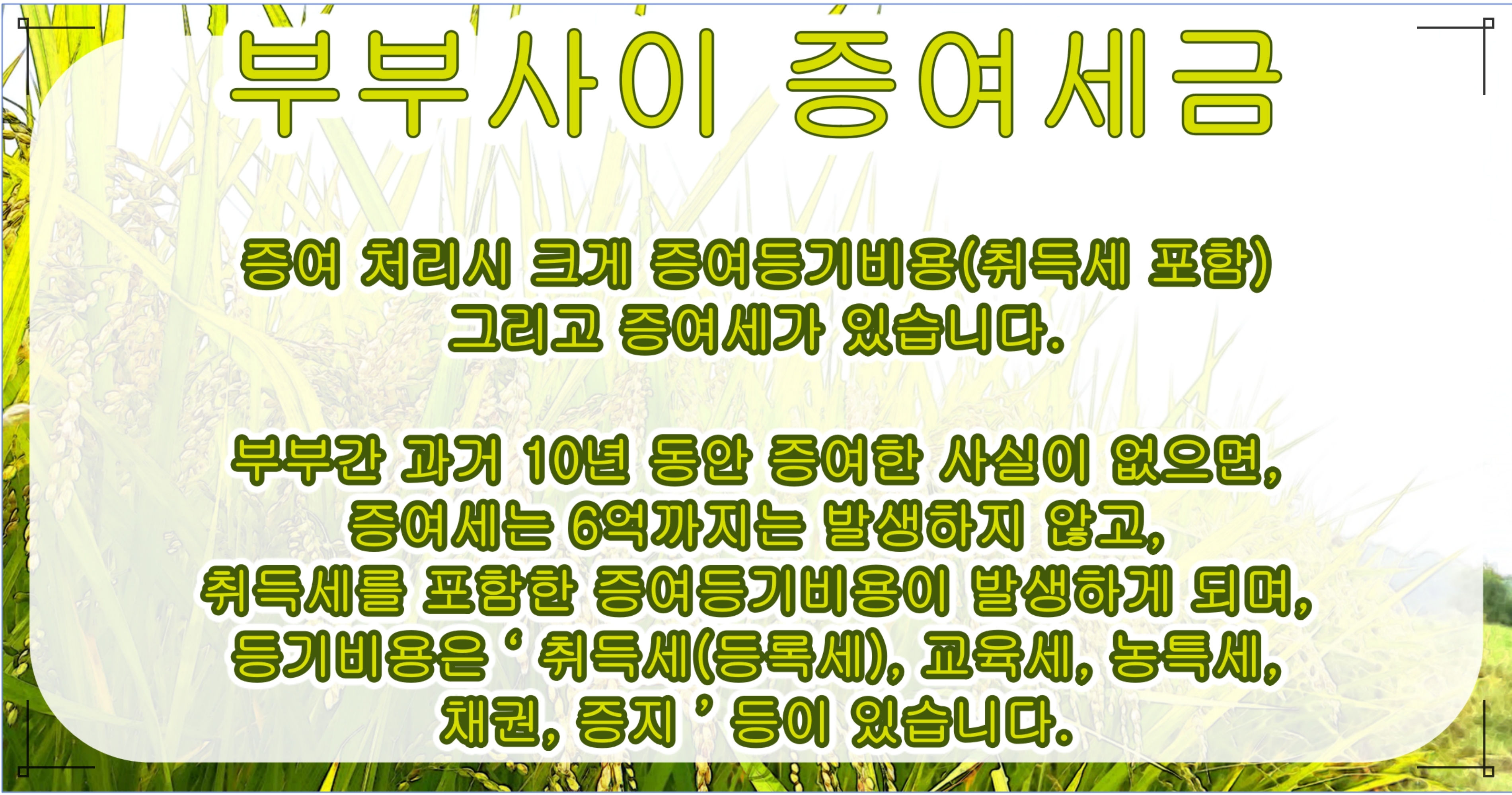 구입금액보다 현재금액이 많이 상승한 상황에서 당장 처분할 계획은 없지만, 여러가지 유리한 상황을 만들기 위해서는 ' 부부증여 ' 로 부부간 명의변경을 한번 해놓으시는게 좋은데, 이는 현재금액 그리고 앞으로 상승할 예상금액도 생각해야 합니다.