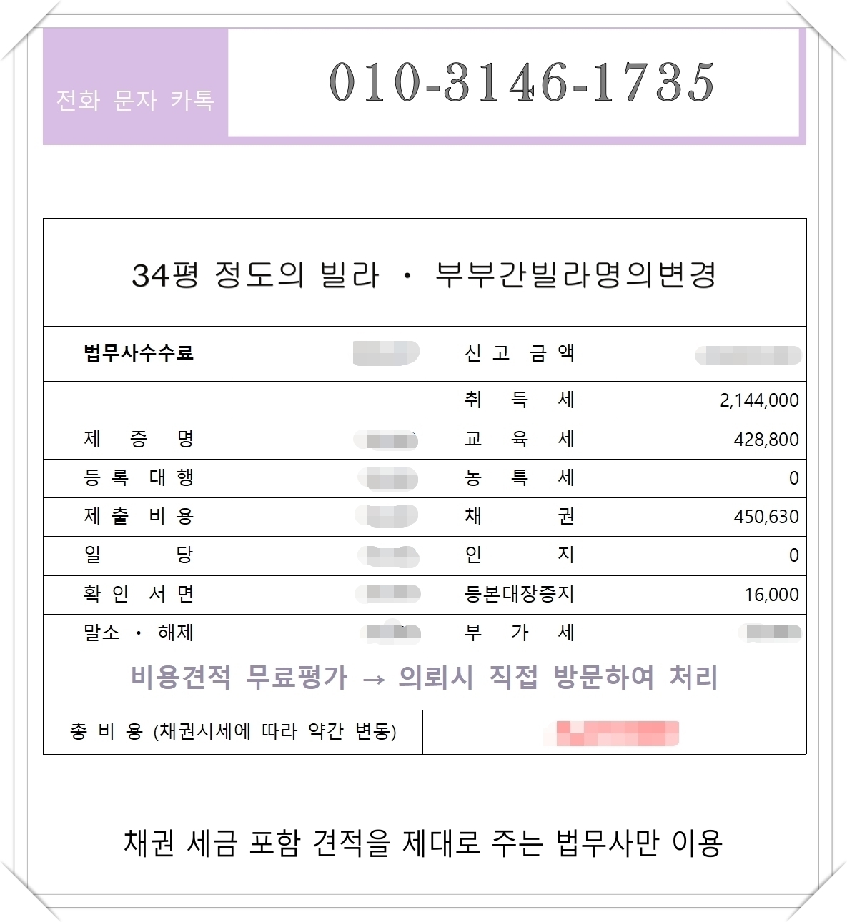 상황에 따라 세금이 더 많더라도 그 방법으로 진행하는 것이 유리한 경우가 있으며, 이러한 부분은 정식으로 의뢰받은 후 법무사에서 내용 정리하여 장단점 설명드립니다.