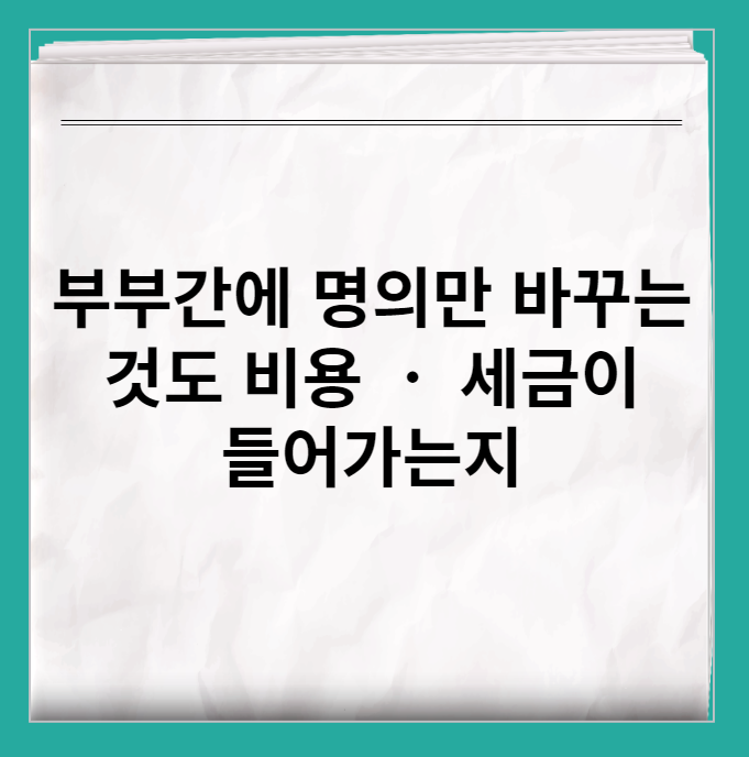 부부간 집 명의변경에는 재산분할 ㆍ 증여 ㆍ 상속 등의 방법이 있는데, 재산분할은 이혼시 하는 것이고, 상속을 사망 후 하는 것이므로, 그게 아닌 경우 ' 증여 ' 의 방법만 있고, 증여로 처리시 증여세 그리고 증여등기비용이 발생합니다.