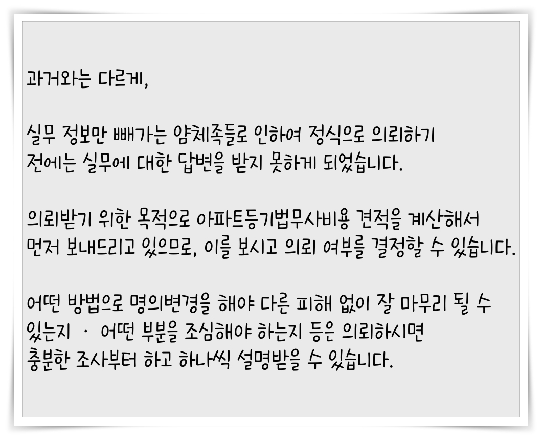 소유권이전(명의변경) 업무를 전문으로 처리하며, 상담 신청하시면