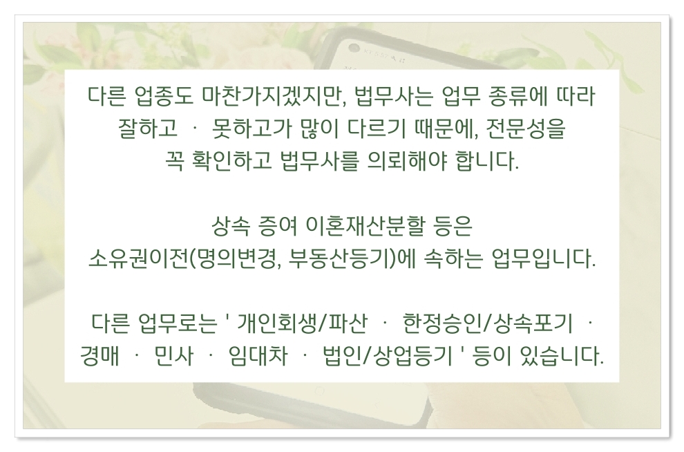 법무사에서 해드리는 명의변경(소유권이전, 부동산등기) 관련 업무 처리만 하면 되고,